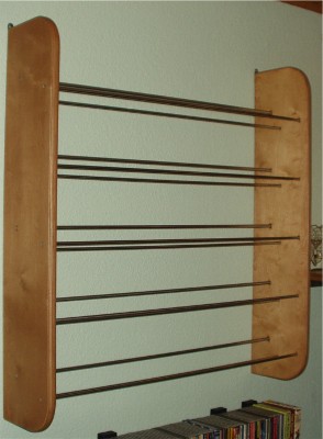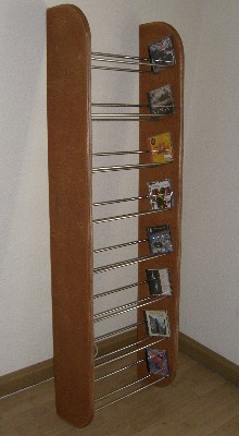 Es besteht aus zwei ca. 30 mm dicken Birken - Multiplex Seiten, zwischen denen pro Fach drei 12 mm dicke, geschliffene Edelstahlstangen angebracht sind. Die seitlichen Platten werden gephast, mehrfach gewachst und poliert. Bei dem abgebildeten Regal wurden die Seiten in Kirsche gewachst. ![]() Das Regal ist zur Wandmontage bestimmt und wird mit zwei Schrauben montiert. Zurück zu "Regale" |