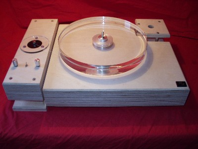 Der Plattenteller besteht aus 40 mm Acryl, CNC - gefräst und poliert gedreht oder aus 40 mm dickem, gedrechseltem Birken- Multiplex. Als Antrieb verwende ich einen kollektorlosen, PLL geregelten Gleichstrommotor, der schwimmend aufgehängt wird. Er findet seinen Platz in einem Gehäuse aus Multiplex. Die Antriebseinheit hat, abgesehen vom Antriebsstring, keinerlei Verbindung mit der Basis. Selbstverständlich beherbergt diese auch die Regel- Potis und den Drehzahlumschalter. Den oberen Abschluss bildet eine 5 mm dicke Acrylplatte. Das auf den Fotos zu sehende Laufwerk befindet sich im Rohzustand, ist aber bereits feingeschliffen. Es kann mit Hartwachs, klar oder farbig ( zum Beispiel in Ebenholz ), gewachst werden und wird anschließend poliert. Das invertierende Tellerlager besteht aus Aluminium, wobei auf einer Hartmetallachse eine Kugel ruht, die wiederum gegen einen Hartmetall- Lagerspiegel läuft. Die Laufbuchse ist aus Messing. Die Tonarmbasis ist ebenfalls aus Multiplex gefertigt. Sie wird auf der Grundplatte in einem Langloch verschoben, sodass alle möglichen Tonarmkombinationen möglich sind. Zudem ist sie in der Höhe, durch Zugabe von Unterlegscheiben, einstellbar. Das Laufwerk ruht auf drei höhenverstellbaren Füßen. Maße über Alles: 545/ 380/ 145 (B/ T/ H), Gewicht ca.25 kg Zurück zu "Laufwerke" |